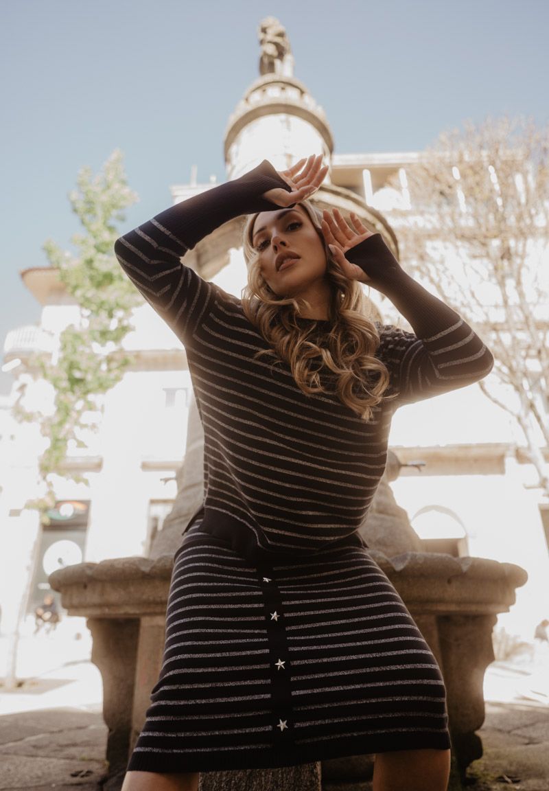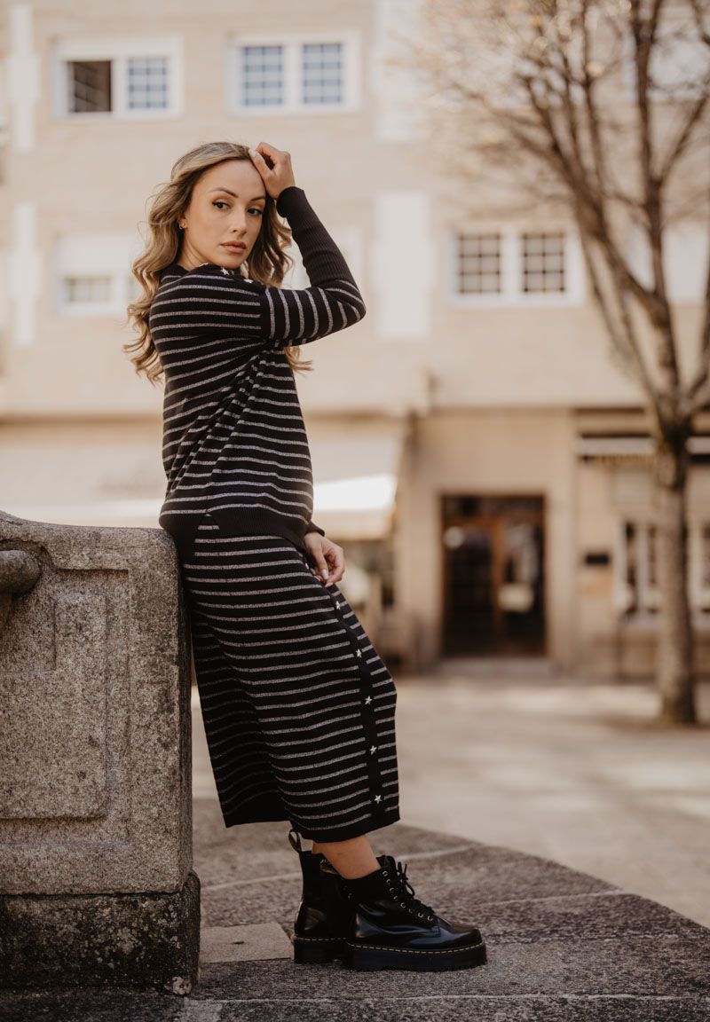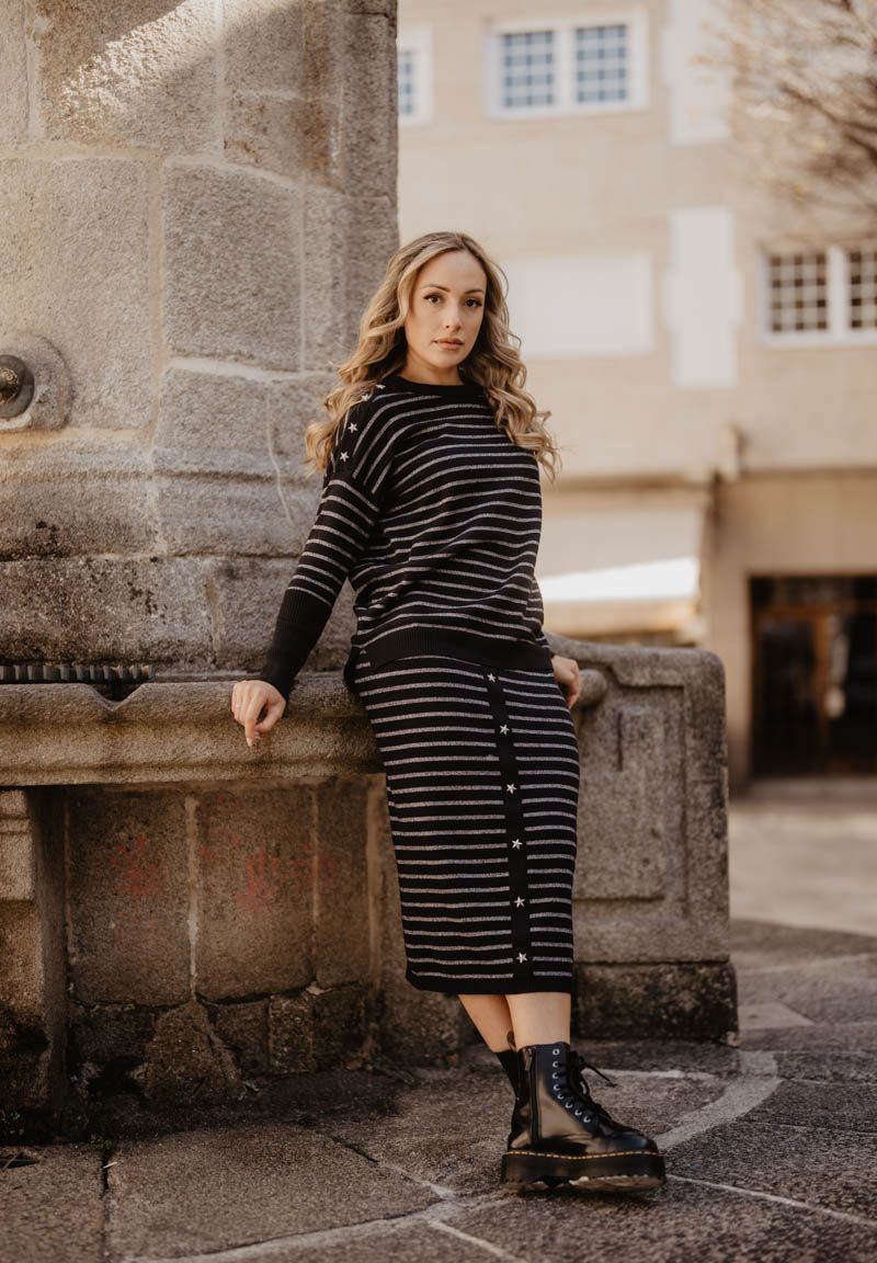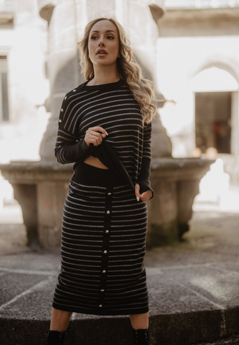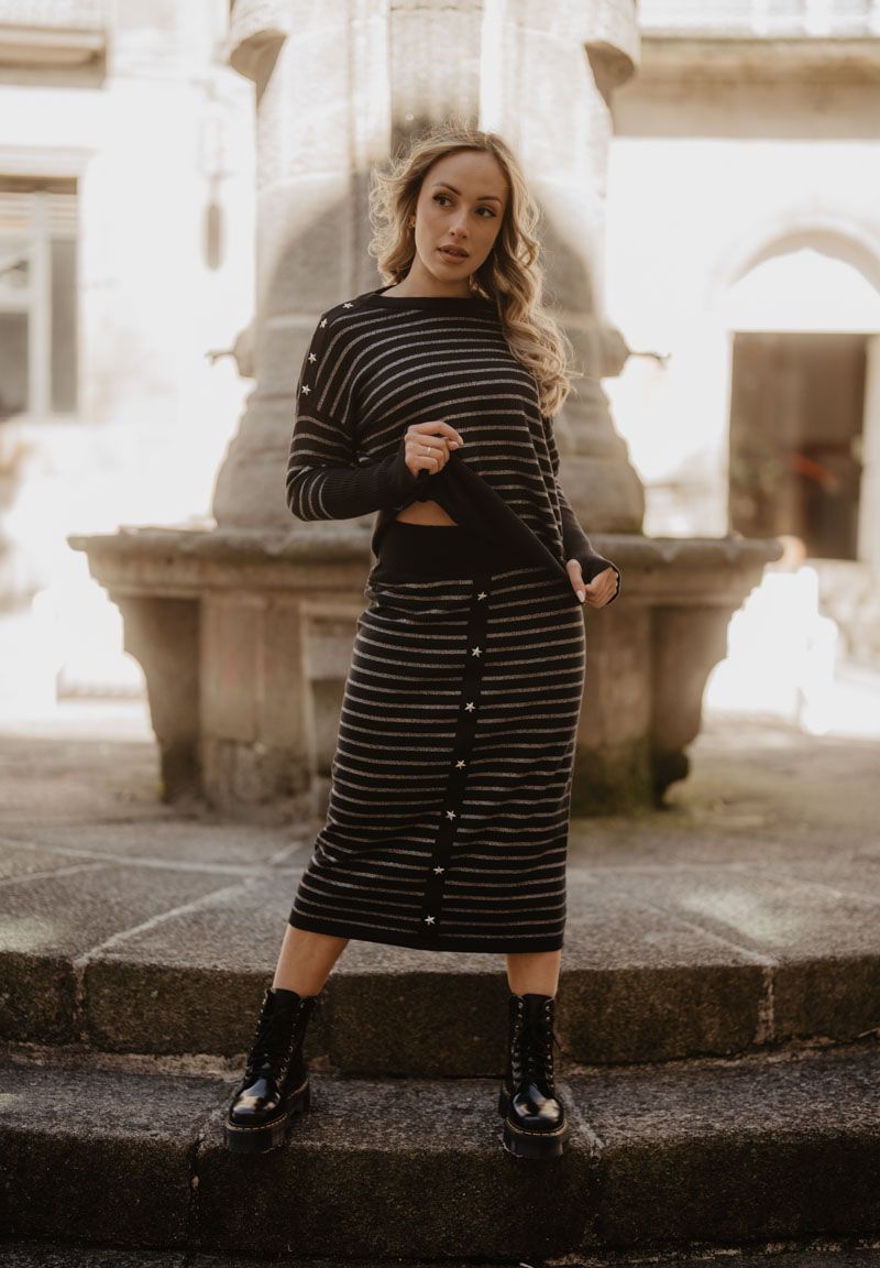 Falda larga de punto, con tira de tachuelas en estrellitas decorativas en la parte frontal. La combinación con las rayas crea un equilibrio entre lo clásico y lo audaz. Ya nos conoces: alma y coraje.