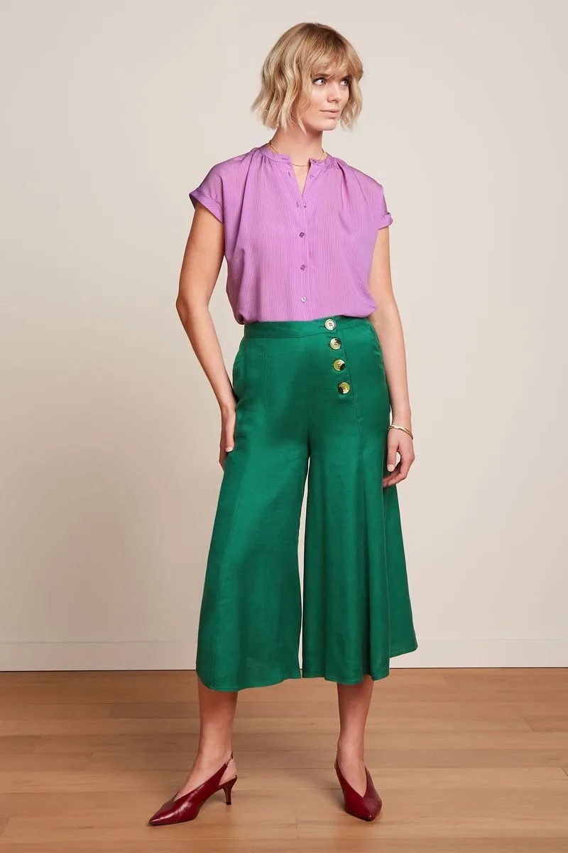 El Pantalón Culotte Dallas de King Louie combina estilo retro y comodidad en una prenda imprescindible. Confeccionado en una mezcla de viscosa LENZING™ ECOVERO™ y lino, ofrece una caída fluida y ligera, perfecta para el día a día. Su diseño con cierre frontal de botones aporta un toque vintage, mientras que su tejido elástico garantiza un ajuste cómodo. Ideal para looks elegantes y relajados.