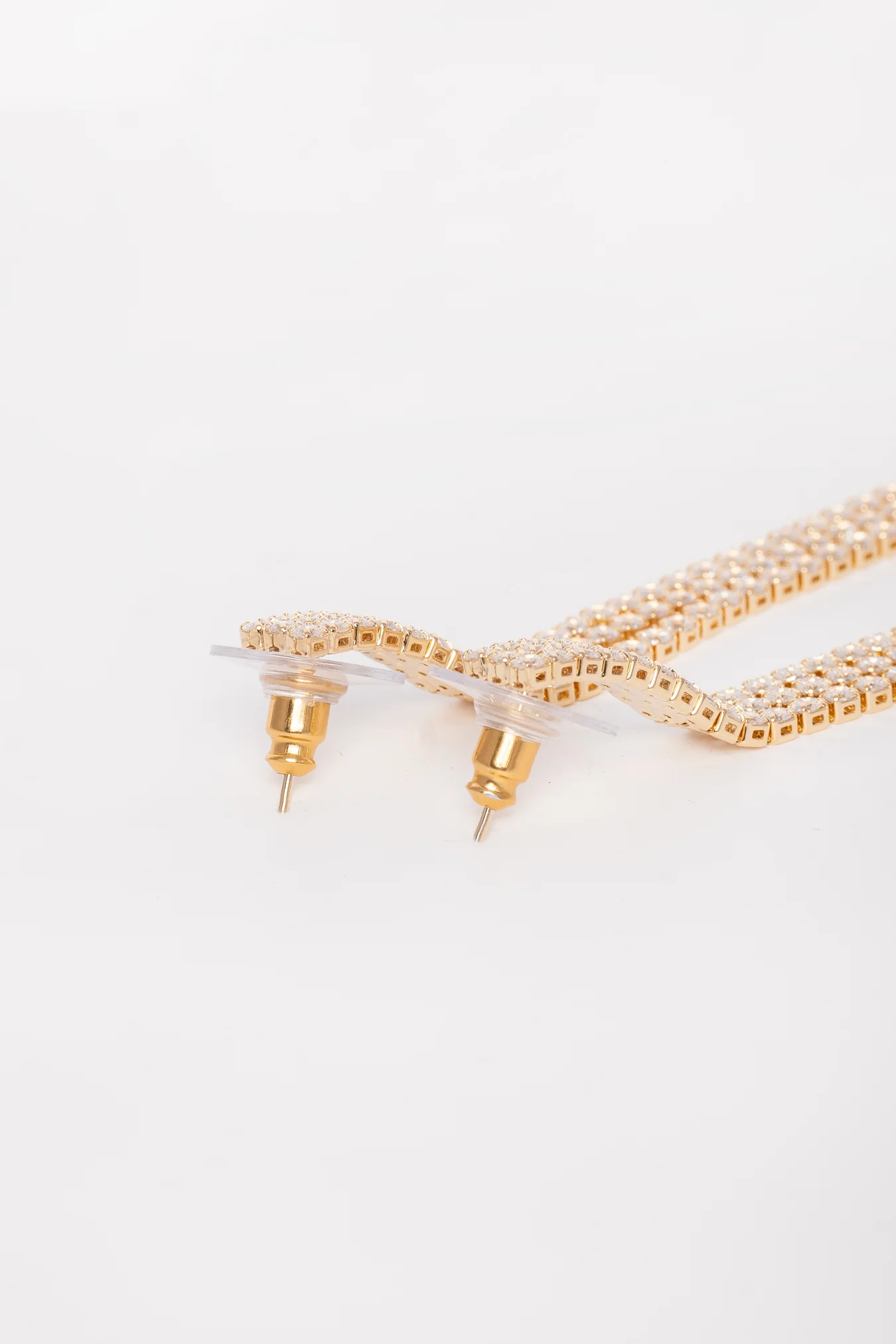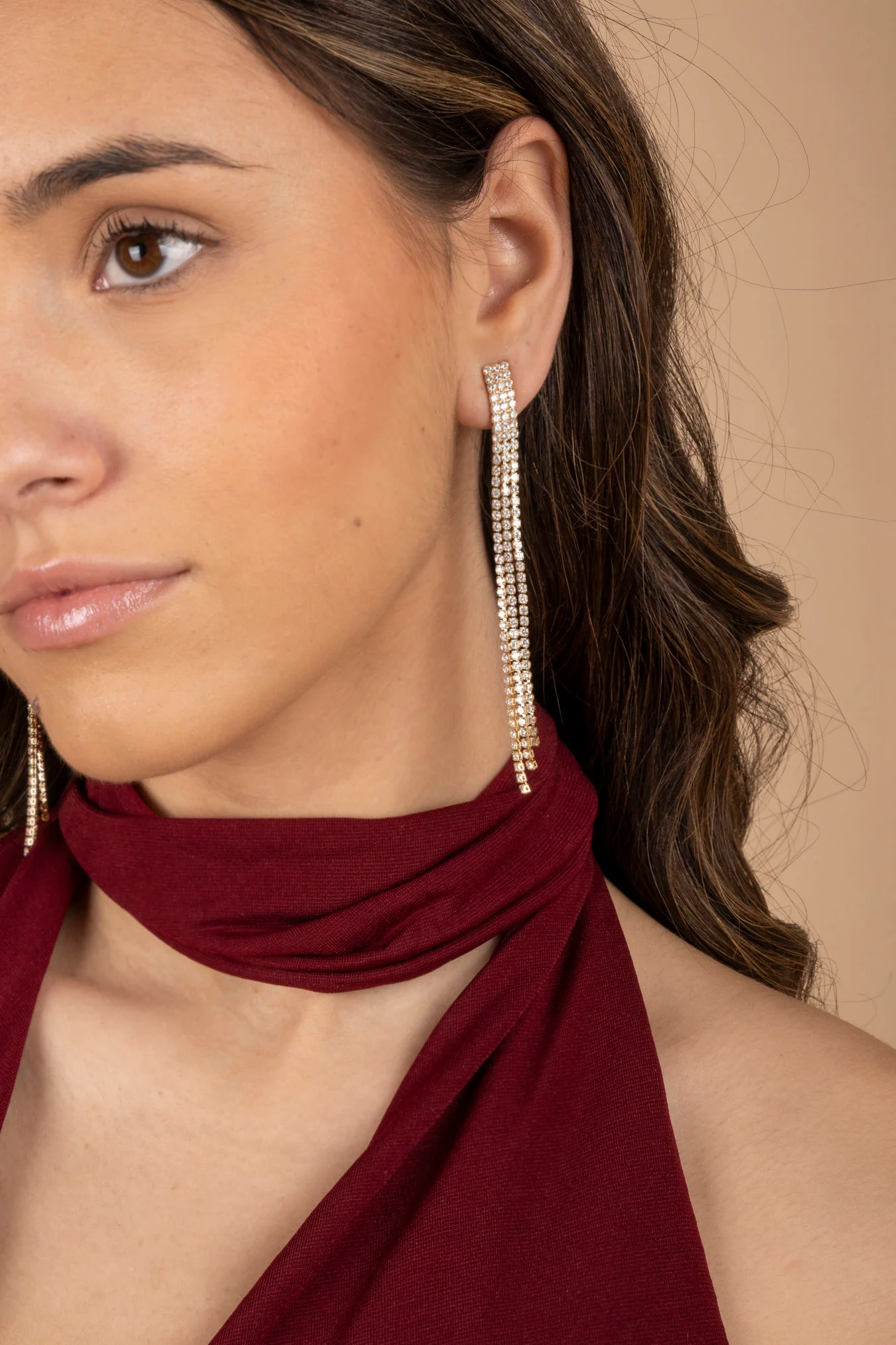 Añade un toque de glamour con los pendientes Bond Oro, ideales para bodas, fiestas y eventos especiales. Su diseño largo en tono dorado con hileras de cristales brillantes aporta elegancia y movimiento. Ligeros y cómodos, con cierre de presión para un ajuste seguro.