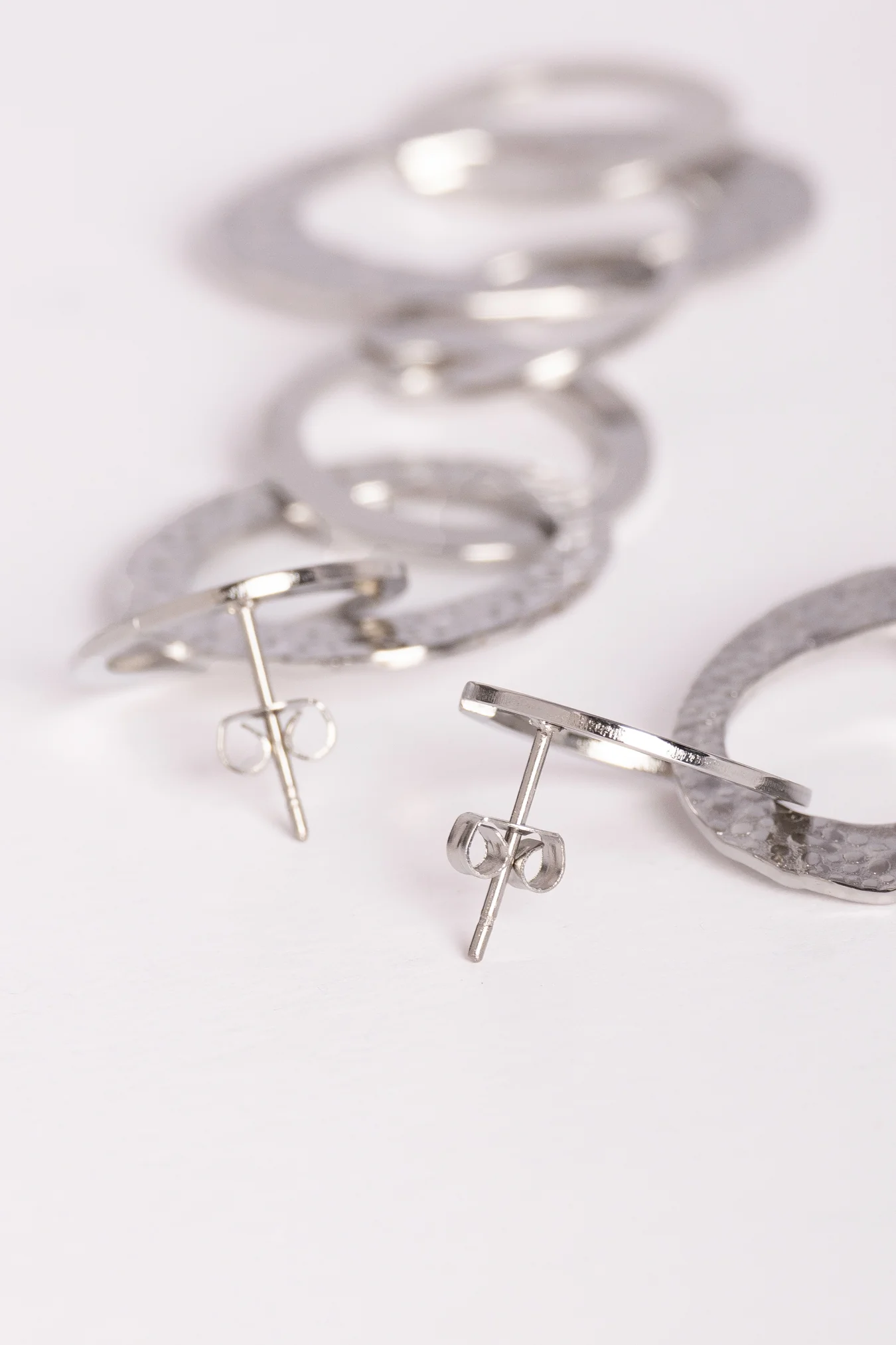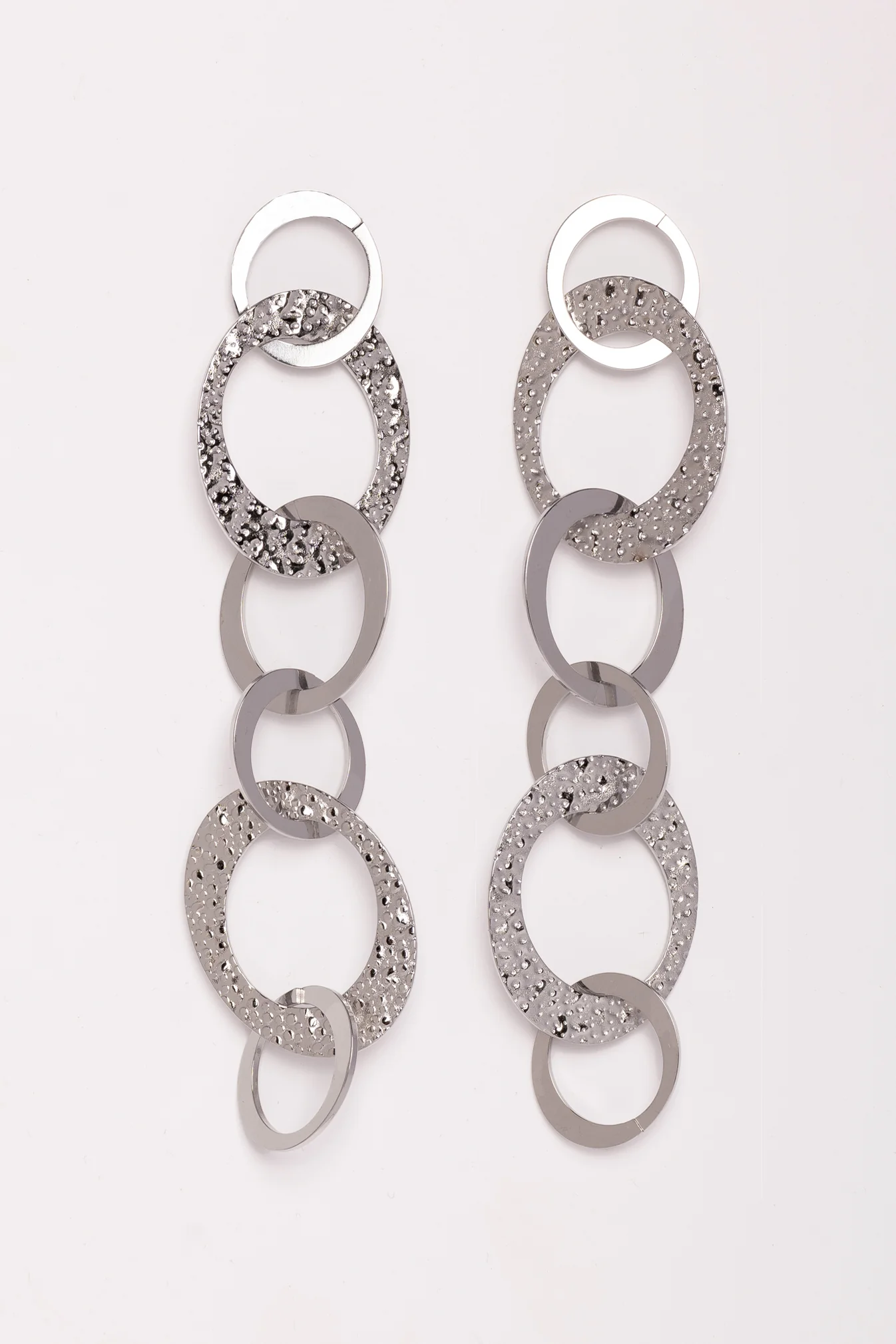 El Pendientes Space es un pendiente largo compuesto por seis círculos ovalados de tres tamaños distintos.
