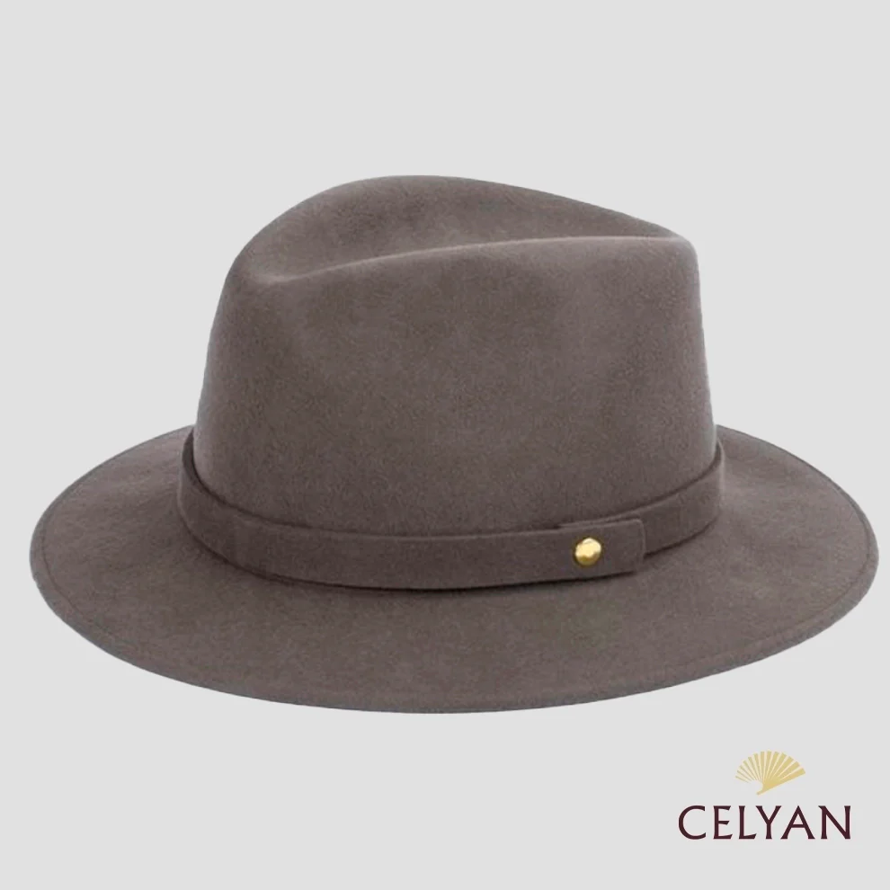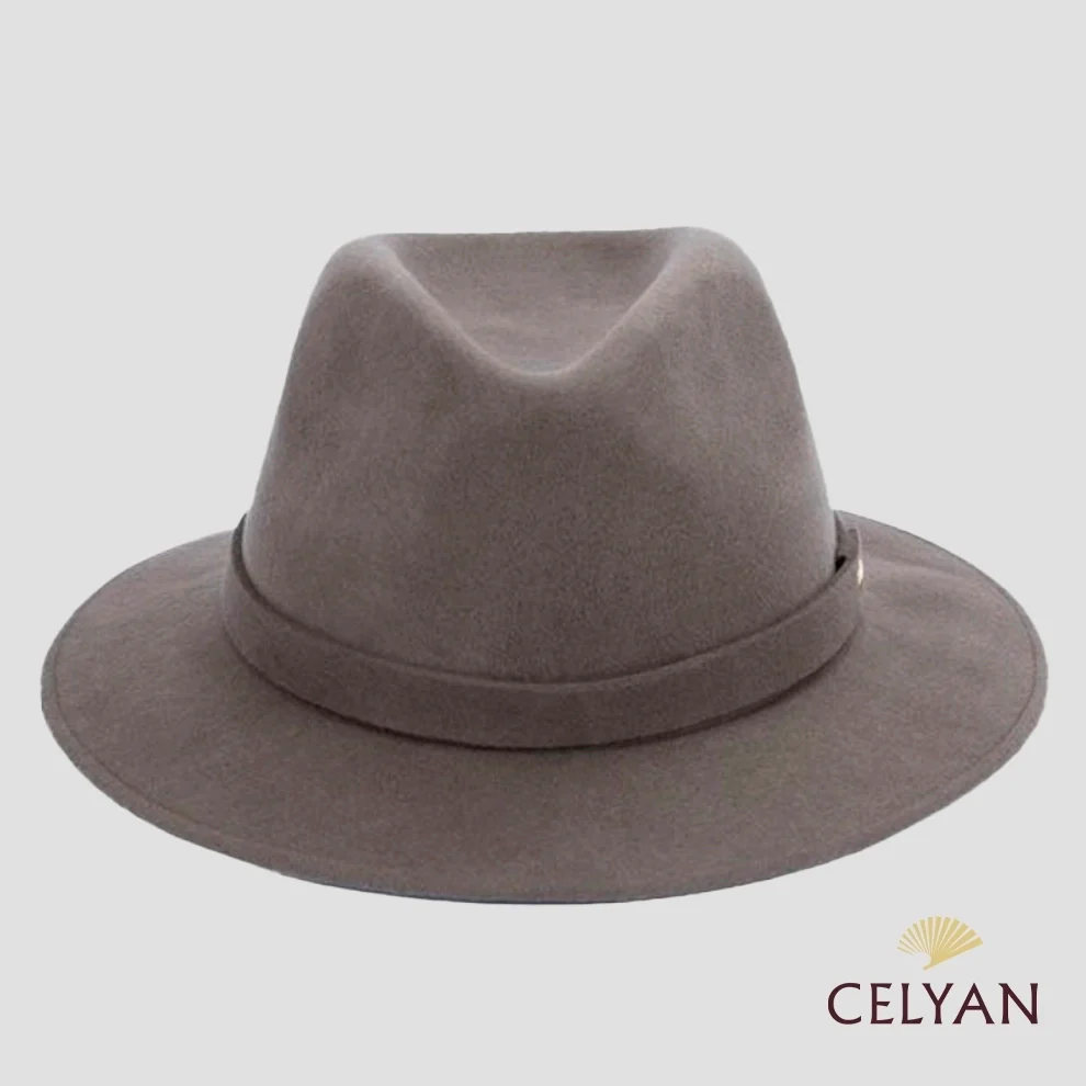 Modelo hecho en calidad 100% fieltro de lana plyfelt. Tiene una copa gota de agua de 10 cm y un ala de 6,5 cm. Alrededor de su copa está decorado con una correa de fieltro a tono, cerrada con cierre dorado. En su interior tiene badana ajustable de algodón aportando un acabado interior perfecto. Fabricado a mano, hecho en España.